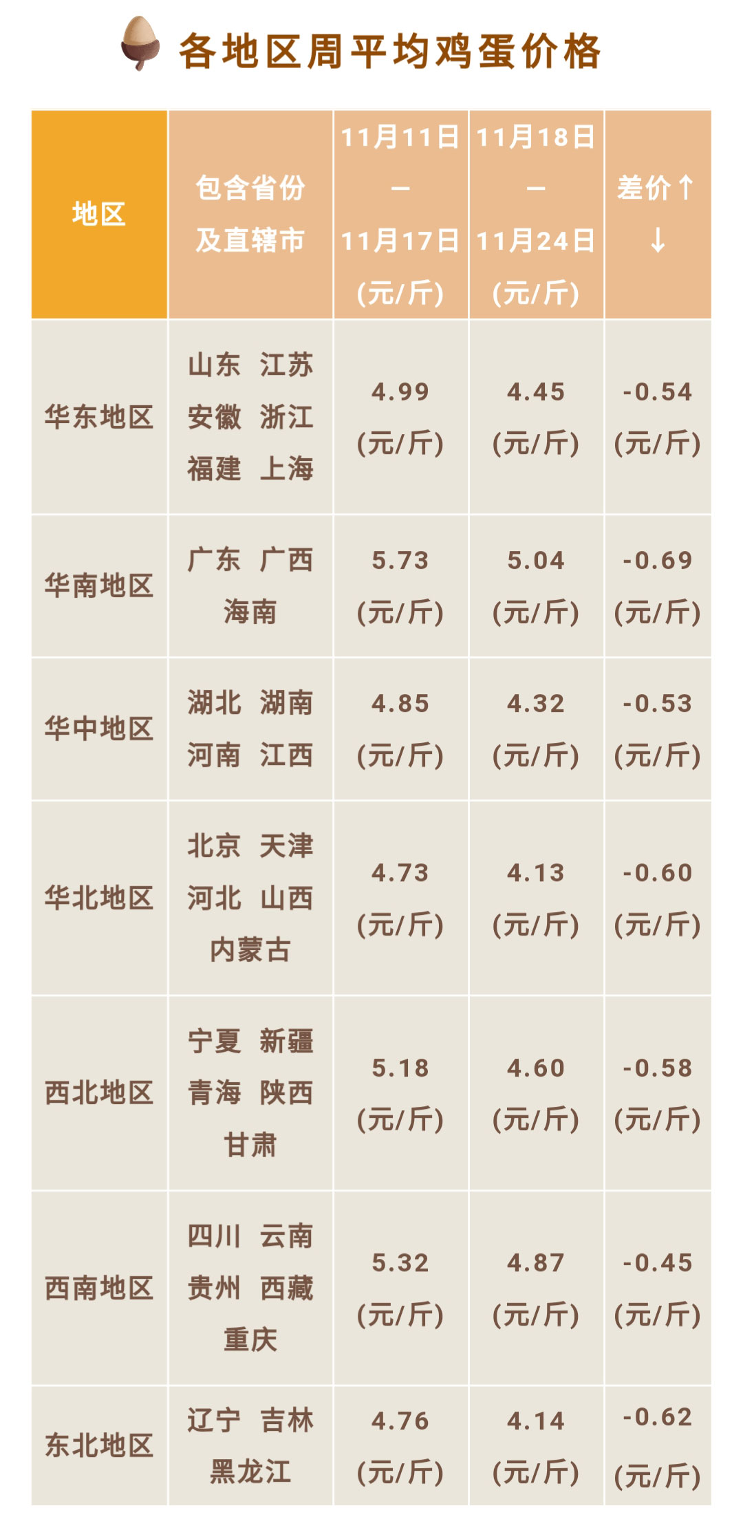 雞蛋價格 | 截止11月24日各地區周平均雞蛋價格及行情分析